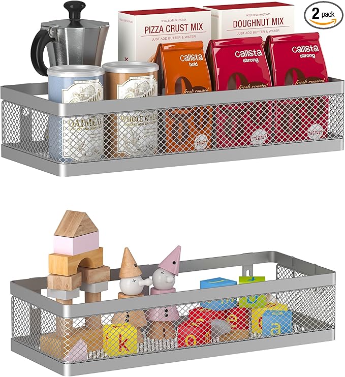 - 【MULTI-PURPOSE&MULTIFUNCTIONAL】The perfect solution for organizing a multitude of every items indoor or outdoor. The cabinet organizer hanging baskets wall mount is Ideal for organizing and storing spice bottles, pantry items, snacks, toiletries, tools, craft supplies,etc. And this metal bin basket free up enough space for your homes, kitchen, living room, bathroom, camper, farmhouse, apartments, college dorm rooms, etc.